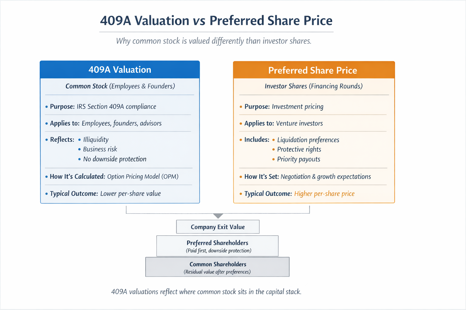 A 409A valuation and a preferred share price answer different questions for different audiences.